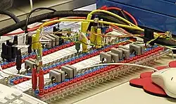 Die Verbindung zwischen den verschiedenen elektrischen Netzen wird durch die bedrahteten Bauelemente selbst hergestellt. Reicht das nicht aus, weil beispielsweise weitere Strecken auf dem Steckbrett überbrückt werden müssen, können Verbindungen mittels Leitungen hergestellt werden. Zum Verschalten eignen sich massive Drähte. Flexible Drähte (Litzen) können nicht direkt in die Kontakte gesteckt werden.