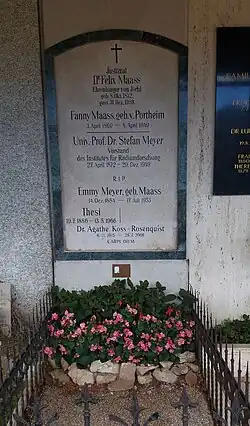 1938 wurde Stefan Meyer wegen seiner jüdischen Abstammung zwangsweise pensioniert. Aus der Akademie der Wissenschaften trat er am 24. November 1938 aus, um ihr Schwierigkeiten zu ersparen und einem Ausschluss zuvorzukommen.[1] Auf Grund seiner guten Beziehungen konnte er die NS-Zeit in Bad Ischl unbehelligt überleben. 1946–47 wirkte er als Honorarprofessor an der Universität Wien und als Vorstand des Instituts für Radiumforschung, bevor er 1947 emeritiert wurde. Am 29. Dezember 1949 verstarb er in Bad Ischl, wo er auf dem dortigen Friedhof begraben wurde.