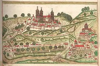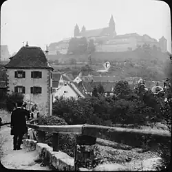 ![]() Steinbach mit Kocher und Pfarrkirche, darüber rechts die Klein- und links die Großcomburg; Bild um 1600