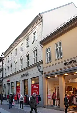 Das dreigeschossige, in massiver Bauweise errichtete Gebäude entstand in der Zeit um 1840. Im Jahr 1911 erfolgte ein Umbau. Sowohl die Fassade als auch die Höhe der Geschosse wurde verändert. Das Treppenhaus wurde mit Verglasungen im Stil des Historismus und des Jugendstils versehen. Mittig im Gebäude war eine Tordurchfahrt angeordnet, in der sich zwei schmiedeeiserne Kellertüren befanden. Die Torflügel wurden während des Umbaus mit barocken und klassizistischen Elementen versehen.