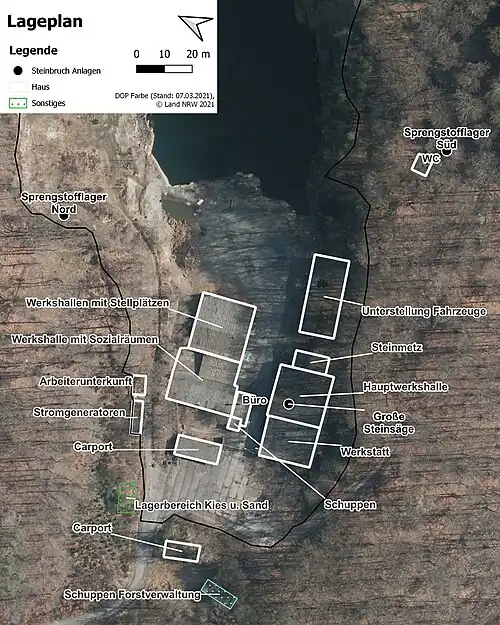 Der Steinbruchkomplex bestand aus verschiedenen Gebäuden und Bereichen, die heute teilweise noch vorhanden sind oder zumindest rekonstruierbar vorliegen. An den großen Werkshallen auf dem Platea die Steinwetz-Werkzeug beinhaltete war zusätzlich ein Büro, eine Werkstatt und Garagen für die Fahrzeuge angebunden. Mehrere Tanks waren an den Bereich angebunden, ebenso ein Hundezwinger, ein Stromgenerator und eine Unterkunft für die Arbeiter. Im Norden und Süden des Geländes war jeweils ein Sprengstofflager in den Fels eingelassen, welche mit Stahltüren verschlossen waren. Als sanitäre Anlage wurde eine kleine Hütte neben dem südlichen Sprengstofflager genutzt. Auf dem Platz vor dem Hauptgebäude wurden Sande und Kiese gelagert und es gab eine Schlackengrube mit Pumpe. Der Platz wurde auch als Lagerraum für die verarbeiteten Blöcke genutzt. Vor dem Platz lagen noch einige Carports und heute eine Lagerhütte der Forstverwaltung Laufenburg. Die meisten der Anlagen sind heute noch vorhanden, sind allerdings sehr starkem Verfall und Vandalismus ausgesetzt. Das Gelände wurde mittels einer Rampe mit dem Parkplatz „Helenasruh“ verbunden, diese Rampe war geteert und ist heute noch durch eine Schranke versperrt.