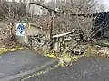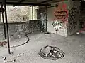 Blick vom Stromgeneratorhaus. Deutlich zu erkennen der zerstörte Eingangsbereich und das Tank. -