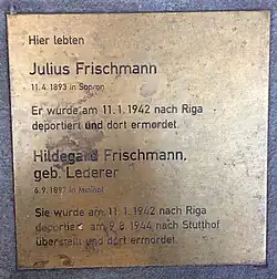 4. Okt. 2018 | Nach der Zwangsumsiedlung in Wien wurden Julius und Hildegard Frischmann nach Riga deportiert. Hildegards wurde später nach Stutthof überstellt. Beide wurden im Holocaust ermordet[17] |