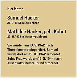 1. Okt. 2020 | Samuel und Mathilde Hacker wurden nach Wien zwangsumgesiedelt und später nach Theresienstadt deportiert. Samuel wurde dort ermordet. Marthilde wurde nach Auschwitz überstellt und ebenfalls ermordet[34][35] |