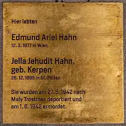 3. Okt. 2019 | Edmund Ariel und Jella Yehudith Hahn wurden nach Maly Trostinec deportiert. Sie wurden im Holocaust ermordet[29] |
