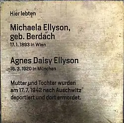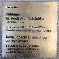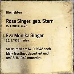 Rosa Schächter wurde nach der Zwangsumsiedelung nach Wien nach Theresienstadt deportiert. Sie wurden im Holocaust ermordet[22] | |||