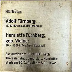 | Adolf Weinstein | Adolf Weinstein wurden nach der Zwangsumsiedelung nach Wien nach Maly Trostinec deportiert. Er wurde im Holocaust ermordet[10] | |||