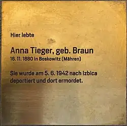 | Amalia Gelb | Amalia Gelb wurde nach Wien zwangsumgesiedelt und nach Maly Trostinec deportiert. Sie wurde im Holocaust ermordet[25] | |||