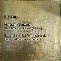 | Wilhelm Weiß | Nach mehreren Zwangsumsiedelungen in Wien wurde Wilhelm und Franziska Weiß nach Opole deportiert. Sie wurden im Holocaust ermordet[12] | |||