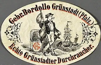 Schloss und Fabrik gingen 1812 an die Brüder Bernhard Bordollo und Wilhelm Bordollo über. Ihre Familie betrieb die Firma mehr als 100 Jahre lang. Auch nach Umwandlung in eine AG., im Jahre 1900, behielt sie einen Aktienanteil. Hatte man ursprünglich nur Fayencenkeramik produziert, wechselte man nach und nach zu der haltbareren Steingutware, die ab 1818 noch ausschließlich gefertigt wurde. Nachweislich hat man in Grünstadt auch mit alten Frankenthaler Porzellanformen gearbeitet, bekannt ist u. a. ein hier produzierter Briefbeschwerer mit nacktem liegenden Knaben, modelliert von Johann Peter Melchior.[2][3] Als König Ludwig I. von Bayern mit seiner Gattin Therese 1829 die damals zu Bayern gehörende Pfalz bereiste, besuchte das Paar am 14. Juni 1829 auch Grünstadt. Beide wurden hier von Bürgermeister Bernhard Bordollo empfangen. In einem zeitgenössischen Bericht heißt es, dass der Monarch sich nach dem Gedeihen der hiesigen Steingutfabrik erkundigte und die „allergnädigste Landesmutter (Königin) geruhte, sich eine Tasse als Probe von dem Fabrikate auszubitten“.[4] Offenbar war für die Majestäten also bereits damals Grünstadter Steingut ein Begriff und sie zeigten lebhaftes Interesse daran. Das Werk expandierte zur größten Fabrik der Stadt und erlangte überregionale Bedeutung. Der Export erfolgte sowohl in die USA und nach Kanada als auch auf den Balkan bzw. in die Türkei. Neben Zier- und Gebrauchsgeschirr stellten Pfeifenköpfe, später auch Uhrenzifferblätter die Hauptprodukte dar. Die Firma war mit einem reichhaltigen Sortiment 1854 auf der Ersten Allgemeinen Deutschen Industrieausstellung vertreten,[5] 1867 beschäftigte sie ca. 70 Mitarbeiter und wurde in der mehrbändigen Landesbeschreibung „Bavaria“ gerühmt für ihre Keramikpfeifen,[6] 1873 stellte man das Pfeifensortiment als herausragendes deutsches Produkt auf der Wiener Weltausstellung aus.[7] Mit Wilhelm Bordollos Enkel Josef Anton Bordollo (1852–1935), Bürgermeister und Ehrenbürger von Grünstadt, schied 1927 das letzte Familienmitglied aus dem Unternehmen aus. Er besaß damals aber bereits nicht mehr die Mehrheit der Anteile.