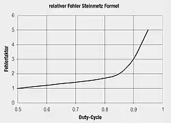 Das sogenannte „Volt-µsec-Produkt“ gibt den Maximalwert an, bis zu dem Speicherdrosseln aufgrund ihrer magnetisch wirksamen Fläche angesteuert werden können. Oder anders ausgedrückt: je höher das Volt-µsec-Produkt, desto höher die Verluste. Mit zunehmender Schaltfrequenz wird das notwendige Vµsec-Produkt der Speicherdrossel geringer; mit steigender Eingangsspannung jedoch größer. Da zur Berechnung der Kernverluste neben dem Volt-µsec-Produkt auch das Tastverhältnis (Duty-Cycle) und die Arbeitsfrequenz der Schaltung essenziell sind, haben diese auch Einfluss auf die Genauigkeit der Steinmetz-Formel. Die Genauigkeit der Steinmetz-Formel ist bei einem Duty-Cycle von 50 % schon geringer, bei kleinen oder großen Duty-Cyclen können Fehler von über 100 % entstehen. Ebenso führen eine Vernachlässigung der Harmonischen oder der DC-Vormagnetisierung zu Ungenauigkeiten bei den errechneten Kernverlusten. Ursachen dafür sind, dass sich eine andere B-H-Kurve einstellt, dass sich ein falsches Vμsec-Produkt ergibt und die Temperaturabhängigkeit nicht berücksichtigt wird.