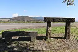 Steinrast Sitzbank an der L82 bei den Roderhöfen bei Bell in der Eifel neben dem Pfosten der gestörten Hochbank. -