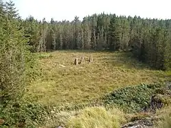 - Stein D steht und ist 2,1 m hoch und misst an der Basis 1,2 × 0,85 m. Er verjüngt sich zur flachen Spitze hin.