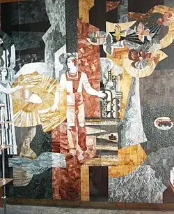 - Personenhafengebäude am Ob („Flussbahnhof“): Wandintarsie (verschiedene Materialien)