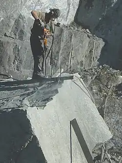 Eine dieser Steingewinnungsmethoden ist die Spaltung der Steine mit Keilen, entweder in Handarbeit oder mit Hilfe von Maschinen.