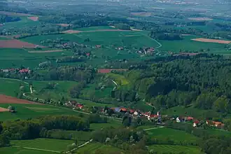 ![]() Im Vordergrund Tränkhof und dahinter Teile des Ortsteils Steinwand gesehen vom Pferdskopf, am oberen Bildrand Petersberg
