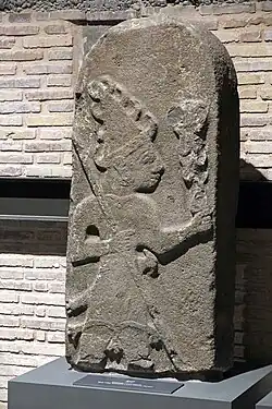 Die Stele aus Basalt ist 1,50 Meter hoch, 0,63 Meter breit und oben abgerundet. Sie zeigt von den Knien aufwärts einen nach rechts gewandten Wettergott. Er ist mit einem kurzen Rock bekleidet und trägt als Zeichen seiner Göttlichkeit den gehörnten Spitzhut. An der Hüfte hängt links, hinter dem Körper, ein Schwert, dessen Scheide in drei fransenartigen Spitzen endet, ähnlich denen seines Rocksaums.[2] Die rechte Hand hält vor dem Körper schräg eine Lanze, deren beide Enden außerhalb der Bildfläche liegen. Die linke Hand ist vorgestreckt. Darüber sind, im gleichen Hochrelief wie der Gott, vier übereinanderstehende Luwische Hieroglyphen dargestellt. Die Lesung lautet DEUS TONITRUS TONITRUS URBS, was der britische Hethitologe John David Hawkins als Wettergott der Stadt Tarḫuntašša übersetzt. Abweichend sieht der deutsche Vorderasiatische Archäologe Kay Kohlmeyer das unterste Zeichen nicht als