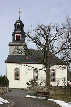 Die kleine Saalkirche mit drei Jochen wurde 1729 erbaut. Aus dem Satteldach des Kirchenschiffs erhebt sich im Westen ein schiefergedeckter, quadratischer Dachturm mit einer achtseitigen Haube, hinter dessen Klangarkaden sich der Glockenstuhl befindet. Außerdem beherbergt sie die Turmuhr. Darauf sitzt eine offene Laterne.