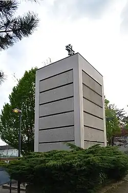 Die Fassade wird durch ein regelmäßiges Muster quadratischer Fenster gegliedert, die einerseits das Motiv des Quadrates aufnehmen und andererseits die Kirche zu einem lichtdurchfluteten Raum machen.