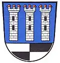 Blasonierung: „Über von Silber und Schwarz gevierten Schildfuß in Blau nebeneinander drei silberne Quadertürme mit rot gedeckten Zinnen.“
