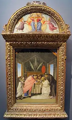 Das Gemälde, das in einen geschnitzten und vergoldeten, ädikulaartigen Rahmen aus der Werkstatt des Giuliano da Maiano gefasst ist, wird bekrönt durch ein Lünette, die von Botticellis Schüler Bartolomeo di Giovanni gemalt wurde. Dargestellt ist die Hl. Dreifaltigkeit in einer Mandorla zusammen mit zwei Engeln, Cherubim und Seraphim.