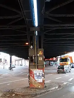 Die stählerne Balkenbrücke wurde aus hochfestem Stahl St 48 gebaut. Sie ist 75 Meter lang und 17 Meter breit und hat zwei Brückenelemente mit je zwei Gleisen. Die Überbauten haben eine Höhe von 2,80 Metern und ein Gesamtgewicht von 888 Tonnen. Die Brücke liegt auf vier einfachen und zwei doppelten Stahlstützen im Straßenraum sowie zwei Widerlagern.[2] Für die Vergrößerung der Durchfahrtshöhe auf vier Meter legte man um 1970 das Straßenniveau tiefer und ständerte die Stahlstützen um bis zu 50 Zentimeter auf. In den Brückengewölben sind Gewerberäume.