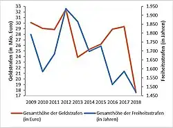 Die Summen der auf Grund von Ermittlungen der Steuerfahndung festgesetzten Geldstrafen und Freiheitsstrafen nahmen von 2009 bis 2018 beide ab.[6]
