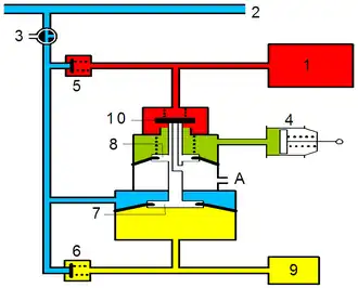 Beim Bremsen wird durch die Zerstörung des Unterdrucks in der Hauptluftleitung der Kolben des Steuerventils nach oben bewegt. Im Steuerbehälter 6 bleibt das Referenzvakuum von 52 cm Hg durch schließen des Rückschlagventils erhalten. Druckluft strömt aus der Speiseleitung 1 durch das geöffnete Einlassventil 9 in die Kammer über dem Regulierkolben 8 und in den Bremszylinder.