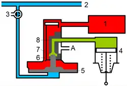 Der Druckanstieg in der Kammer über dem Regulierkolben bewirkt, dass der Kolben des Steuerventils nach unten gedrückt und das Einlassventil geschlossen wird.