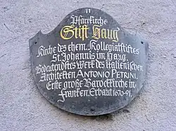 1670 bis 1691 schuf Antonio Petrini, dessen Hauptwerk der Hauger Kirchenbau ist, die Synthese zwischen mitteleuropäischer Doppelturmfassade und römischer Kuppelanlage, deren schlanke Türme mit der wuchtigen, schiefergedeckten Kuppel ein weithin das Stadtbild prägendes Element bilden. Die große, vom Petersdom inspirierte Vierungskuppel steigt bis zu einer Höhe von 60 Metern auf. An der höchsten Stelle im Inneren der Kuppel ist in einem Strahlenkranz das Symbol des Heiligen Geistes, die Taube, erkennbar. Die Auflösung von Wandgrenzen durch Arkaden geht auf eine Idee von Donato Bramante zurück, der eine solche um 1480 im Innenraum der Kirche Santa Maria presso San Satiro in Mailand verwirklicht hatte.[6] Petrini war der führende Baumeister des Barock in Franken in der zweiten Hälfte des 17. Jahrhunderts und seine Hauger Stiftskirche war der erste monumentale Barockbau nach dem Dreißigjährigen Krieg in Würzburg.[7]