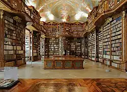 Den Bau eines Bibliothekstrakts (ein erster war früher als Annexbau an anderer Stelle geplant) in der Mitte des Ostflügels überantwortete man Baumeister Gotthard Hayberger aus Steyr. Der Hauptsaal der zwischen 1744 und 1751 erbauten Stiftsbibliothek ist ein Juwel des Spätbarock. Die Bücherregale, die Empore und die Türen wurden von regionalen Handwerkern gefertigt und zeugen von der hohen Qualität ihrer Arbeit. Die Figuren des Deckenfreskos Verbindung der Tugend mit der Wissenschaft (bez. 1747) schuf Bartolomeo Altomonte, die Architekturmalerei Antonio Tassi. Der Gesamtentwurf des Gemäldes stammt von Daniel Gran.[13][14]