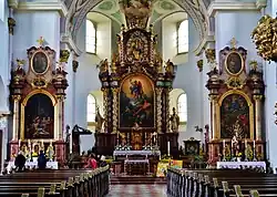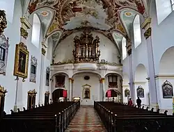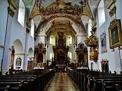 Die Kirche zeigt bemerkenswerte Deckenfresken des bayrischen Hofmalers Christian Wink (1778/1779), im Langhaus das Bild Ordensstiftung durch Augustinus von Hippo mit Signatur und Selbstbildnis des Meisters und Erscheinung vom Erzengel Michael auf dem Berge Gargano, im Chor Verehrung des Namens Jesu und der Psalmist David, in der Kirchenvorhalle Schuhlösender Moses und Brennender Dornbusch.