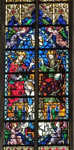 In der Eingangshalle erinnert ein 1909 von Hans Brandstetter geschaffenes Epitaph an den Architekten der Kirche, Wilhelm Bücher.