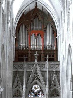 Nach der Zerstörung der Chrismann-Orgel wurde 1870–1871 von Mathias II. Mauracher (er selbst nannte sich Matthäus und wird auch in der Literatur häufig als Matthäus der Ältere tituliert) ein neues Werk mit 3 Manualen und Pedal (42 Register) erbaut, das 1909 von seinem Sohn Matthäus II. Mauracher auf 61 Register erweitert wurde.[13] Mit dieser Erweiterung, die auf die Initiative des Admonter Stiftsorganisten Viktorin Berger hin erfolgte, „wurde die Admonter Stiftsorgel damals eine der größten der österreichischen Alpenländer“.[14] Auf dieser Orgel spielte am 15. September 1891 Anton Bruckner, „immer im Pleno. Drei feste Kalkanten mußten den großen Blasbalg treten, um den Pfeifen den benötigten Wind zu liefern.“