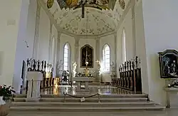 Der Innenraum des Langhauses ist mit einem Kraggewölbe überspannt. Zur Kirchenausstattung gehört ein Hochaltar, dessen Altarretabel 1767 Johann Pfunner gemalt hat. Die Orgel mit 37 Registern wurde 2016/17 von Tilman Trefz in das Gehäuse der ersten Orgel von Johann Christoph Albrecht (1722) gebaut.[1][2]