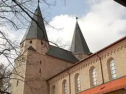 Jedoch wurden 1150/60 die Pläne geändert, und mit dem Beginn des Westbaus und der Ausführung des Langhauses wurde mit asketischer Formensprache ein deutlicher Gegensatz zu der schmuckreichen Ostpartie gesetzt. Hier fand eine Rückkehr zu den ältesten lokalen Bautraditionen mit einem rechteckigen, niedersächsischen Westbau mit zwei Türmen statt. Das Hauptschiff wurde erst 1695 eingewölbt, bis dahin hatte es eine bei romanischen Kirchen häufige flache Holzdecke. Chor und Nebenschiffe wurden bereits beim Bau als Kreuzgewölbe ausgeführt.[3]