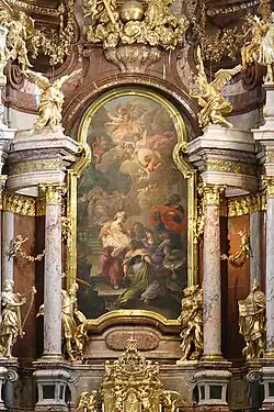 Über dem Hochaltarbild von Johann Georg Schmidt befindet sich ein spätbarockes Chor-Kuppelfresko von Johann Michael Rottmayr von 1729, das die Himmelfahrt Mariens zeigt und mit Scheinarchitekturmalerei von Gaetano Fanti kombiniert wurde. Die Figurengruppe des Hochaltares schuf Hof-Bildhauer Franz Caspar.
