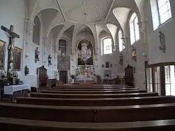 Im Inneren präsentiert sich die Stiftskirche als ein lichter, einschiffiger Raum in der Art eines Kongregationssaals, wie zum Beispiel auch der Bürgersaal in München. Seit dem Wiederaufbau Ende des 19. Jahrhunderts wird der Saalraum von einem flachen Tonnengewölbe mit Stichkappen überspannt. Diese ruhen auf Volutenkonsolen an flachen Pilastern. Das Gewölbe wird von einfachen Stuckrahmen in Felder geteilt, die wohl ursprünglich für eine Bemalung vorgesehen waren. Im westlichen Langhausjoch ist eine Orgelempore mit geschweifter Brüstung eingezogen, die auf zwei rechteckigen Säulen ruht. Darunter befindet sich der Zugang zu der Gruft, die seit 1769 den Kanonikern als Grablege dient. Diese ist quer zum Langhaus der Stiftskirche angelegt.[3]
