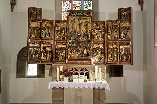 Der 1496 geweihte Passionsaltar zeigt als großes Mittelbild eine Golgotha-Szene. Auf einer (im Original nicht mehr erhaltenen) lateinischen Urkunde wird über die Weihe u. a. folgendes berichtet:
