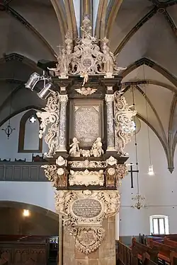 Kanzel und Taufbecken stammen aus der Barockzeit. Die Kanzel an einer Vierungssäule wird von einer Mosefigur gestützt.