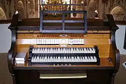 - Spielhilfen: 1 freie Kombination, Schwelltritt, Feste Kombinationen P, mF, F, Tutti; Windzeiger, Schwellwerksanzeiger