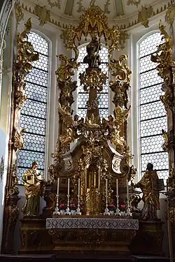 Der heutige Hochaltar ist eine Rekonstruktion des 1759 von Johann Baptist Dirr geschaffenen und 1864 zerstörten Altares, die im Jahr 1908 der Bildhauer Jakob Helmer fertigte. Nur mit dem konkav geschwungenen Sockel füllt der Hochaltar die gesamte Breite des Presbyteriums aus; darüber ist er in filigranen Formen zwischen die beiden äußeren Fenster eingefügt. Der Altartisch wird von den beiden lebensgroßen Figuren des Evangelisten Johannes (links) und des Propheten Jesaja (rechts) flankiert. Die Predella hat einen Fries aus Rocaillen und endet seitlich in Voluten. Mittig ist der vergoldete Tabernakel angeordnet; darüber wird eine reich verzierte Aussetzungsnische von mächtigen Voluten eingerahmt.[16]
