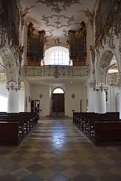 Dementsprechend ist auch die Ausleuchtung des Mittelschiffs verhältnismäßig schlecht. Es bezieht sein Licht beinahe nur vom großen Westfenster auf der Orgelempore und von den Chorfenstern, sodass Stuck und Fresken wesentlich schlechter zur Geltung kommen als in einem vergleichbaren, lichten Rokokosaal. Die Westempore erstreckt sich in unterschiedlicher Höhe über alle drei Schiffe und überdeckt beinahe das gesamte rückwärtige Langhausjoch. Unter der Empore ist im südlichen Seitenschiff die neue Sakristei eingebaut, die 1760 aus dem engen, finsteren Sakristeianbau an der Ostfassade dorthin verlegt wurde. Als Pendant entspricht ihr die Heilig-Grab-Kapelle unter der Empore im Nordschiff. Sie entstand bei der neugotischen Renovierung und besitzt eine flache Kassettendecke mit applizierten Sternrippen.[13]