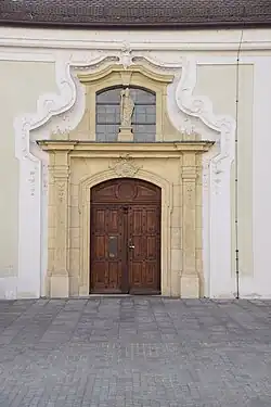Wie die Fensteröffnungen ist auch das von einer Hausteinrahmung eingefasste Portal segmentbogig abgeschlossen. Über der Türe befindet sich eine Kartusche mit der Inschrift „PRIMA/ECCLESIA/S. CASSIANI. CIVIU(M)/PAROCHIA“ (Erste Kirche des heiligen Kassian. Pfarrkirche der Bürger). Diese innere Hausteinrahmung ist in eine Hohlkehle eingelassen, die von einer Art Portikus umgeben ist. Zwei Pilaster tragen dabei ein verkröpftes Gesims mit einer rund 80 Zentimeter hohen Figur des Kirchenpatrons Kassian. Dabei handelt es sich um die Kopie einer spätgotischen Steinskulptur, die bei der jüngsten Renovierung angefertigt wurde. Die Originalfigur wird in einem Depot verwahrt. Hinter der Figur befindet sich ein korbbogiges Fenster, das deutlich kleiner als die übrigen Langhausfenster ist und von einem Gesims bekrönt wird. Letzteres weist allerdings keine streng architektonische Form auf, da im Vergleich zum unteren Gesims die Pilaster fehlen. Diese Konstruktion ist in einem ockerfarbenen Ton gehalten und wird von einer dritten Rahmung aus weißem Bandelwerk eingefasst, die in bester Rokokomanier frei von jeder architektonischen Vorgabe geformt ist. Als Dekor dienen stuckierte Rosenblütenzweige, Rocaillen und ein Eierstab. Dieser Rahmen wird von einer Rokokokartusche ohne Inschrift bekrönt.[13]