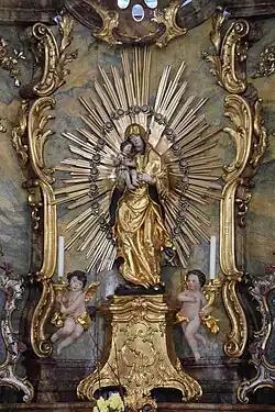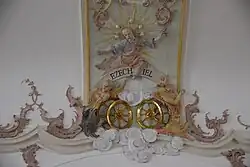 Der Überbau des Tabernakels schwingt nach oben hin mit einem Wellenbogen, aus dem in der Mitte eine Art Obelisk entspringt, der sich nach oben verjüngt. In seinem unteren Drittel liegt auf Gewölk das Buch mit den sieben Siegeln, darauf wird das Lamm Gottes von zwei scheinbar schwebenden Anbetungsengeln verehrt. Die Darstellung ist von einem Strahlenkranz hinterfangen. An der Stelle dieser Figurengruppe befand sich im ursprünglichen Hochaltar das Gnadenbild der „Schönen Maria“, das sich heute am rechten Seitenaltar befindet. Die heutige Darstellung mit Elementen aus der Offenbarung des Johannes entstand erst bei der Rekonstruktion des Hochaltars im Jahr 1908. Auf halber Höhe des Obelisken, der für den Betrachter nur bei genauem Hinsehen als solcher identifiziert werden kann, befinden sich – wiederum auf Wölkchen – zwei kleine Cherubim.[16]