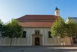 Die Westfassade zur engen Malergasse wird von dem ausnahmsweise rundbogig abgeschlossenen Portal, der segmentbogig abgeschlossenen Fensteröffnung darüber und einem kleinen Rundfenster gegliedert. Oberhalb davon ist das von einem Engel gehaltene Wappenschild des Stiftsdekans Joseph Hayden zu sehen, der die Umgestaltung im Jahr 1477 zu verantworten hatte. Es zeigt die Büste eines bärtigen Mannes mit Hut, dessen Band nach hinten flattert. Unmittelbar unterhalb davon schließt sich ein etwas breiter, aber niedrigerer Stein an, der die Jahreszahl „1477“ trägt. Beide Steine wurden aber erst im Jahr 1749 an der Westfassade angebracht. Als oberer Abschluss dient der schmucklose Dachreiter, der allseitige Schallöffnungen aufweist und von einem im 19. Jahrhundert aufgesetzten, pyramidenähnlichen Helm bekrönt wird.[13]