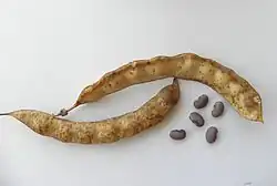 Die gegliederte, geschnäbelte und mit einem kurzen Karpophor gestielte Hülsenfrucht mit beständigem Kelch ist 6 bis 20 Zentimeter lang sowie 1,5 bis 3 Zentimeter breit, kahl, flach und an beiden Enden spitz.[4][5] Die Frucht öffnet sich oder auch nicht und enthält bis 8 Samen.[10] Die bohnen- und leicht nierenförmigen, bis 1–1,5 Zentimeter großen und abgeflachten, harten, glatten Samen sind violett und teils gelblich gefleckt.[3][5][12]
