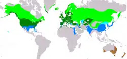 Die Stockente kommt auf der ganzen Nordhalbkugel vor, von Europa über Asien bis nach Nordamerika. In Nordamerika fehlt sie lediglich im äußersten Norden in den Gebieten der Tundra von Kanada bis nach Maine und ostwärts bis nach Nova Scotia. Ihren nordamerikanischen Verbreitungsschwerpunkt hat sie in der sogenannten Prairie Pothole Region von North und South Dakota, Manitoba und Saskatchewan.[10] In Europa fehlt sie nur in höheren Gebirgslagen. In den Alpen ist sie in offeneren Tälern bis in Höhenlagen von 1000 Metern noch häufig, die höchstgelegenen Brutplätze wurden in Lagen von etwa 2000 Metern registriert.[11] In Asien meidet die Stockente die kälteste Tundra und kommt bis in den Osten des Himalayas vor.[12] Als Brutvogel ist sie damit auf die Holarktis begrenzt. Lediglich zur Überwinterung erreicht sie auch die orientalische Region. So überwintert sie beispielsweise in den Ebenen Nordindiens und im Süden Chinas.