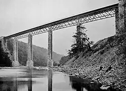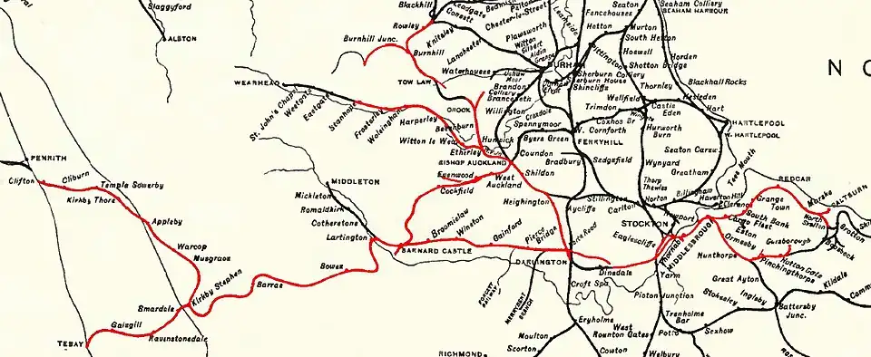 Das Eisenerz aus Cleveland ist stark phosphorhaltig und musste daher mit reineren Erzen gemischt werden, wie z. B. mit solchen von der Westküste in Cumberland und Lancashire.[120] In den frühen 1850er Jahren wurde dieses Erz auf dem langen Weg über die Newcastle and Carlisle Railway in die Gegend von Barrow-in-Furness transportiert. Am 20. September 1856 wurden sowohl die South Durham and Lancashire Union Railway (SD&LUR) als auch die Eden Valley Railway (EVR) gegründet. Die SD&LUR machte sich die neue Bahn bei Barnard Castle zunutze. Sie sollte von dort aus via Kirkby Stephen die Pennines überqueren und in Tebay auf die West Coast Main Line (WCML) treffen; außerdem verband sie Barnard Castle mit West Auckland. Die EVR wiederum war eine Zweigstrecke, die im Tal des Eden von Kirkby Stephen über Appleby-in-Westmorland bis zur WCML bei Penrith führte. Am 13. Juli 1857 erhielt die SD&LUR die königliche Zustimmung, am 21. Mai 1858 auch die EVR. Beide Strecken waren von Thomas Bouch vermessen worden.[121] Er hatte eine wirtschaftliche Trasse entworfen, die den Konturen folgte und Tunnel vermied, dennoch waren bis zum 418 m hohen Stainmore Summit beachtliche Steigungen zu bewältigen. Die SD&LUR kaufte zwar Grundstücke, die Platz für zwei Gleise geboten hätten, nutzte die Trasse aber nur für ein Gleis. Seitentäler wurden mit Viadukten überquert, darunter der 317 m lange und 60 m hohe Belah-Viadukt. Anstelle der bisherigen Endstation in Barnard Castle entstand ein Neubau.[122][123]