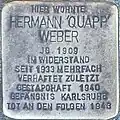 HIER WOHNTE HERMANN 'QUAPP' WEBER JG. 1909 IM WIDERSTAND SEIT 1933 MEHRFACH VERHAFTET ZULETZT GESTAPOHAFT 1940 GEFÄNGNIS KARLSRUHE TOT AN DEN FOLGEN 1940 |